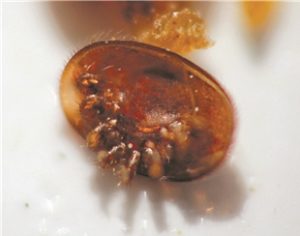 Следующий яйца откладываются каждые 30 часов и выходят из них женские особи. Из яиц появляется личинка уже после первой линьки – протонимфа. В течение 5 дней она питается гемолимфой личинки, линяет и превращается в дейтонимфу, откармливается еще два дня и превращается в имаго, т.е светло-коричневую молодую самку Varroa (все личиночные стадии паразита имеют светлый окрас – белый или желтоватый.