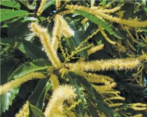 Пчелы охотно посещают каштановые цветы, преимущественно мужские. Они выделяют нектар и большое количество пыльцы. Облет пчел длится почти весь день. Концентрация сахаров в нектаре составляет 20-40%, среди них доминирует фруктоза.