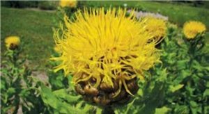 Листья, растущие в нижней части, имеют продолговатую ланцетную форму, они шерсткие, черешковые. Листья стебля более узкие, а те, что расположены в верхней части стебля, сидячие (без черешков). В июле-августе на растении появляются золотисто-желтые корзинки диаметром 5-9 см, образованные в среднем из 240 трубчатых цветков. Одно растение производит около 20 корзинок. Каждое соцветие цветет 8-12 дней.